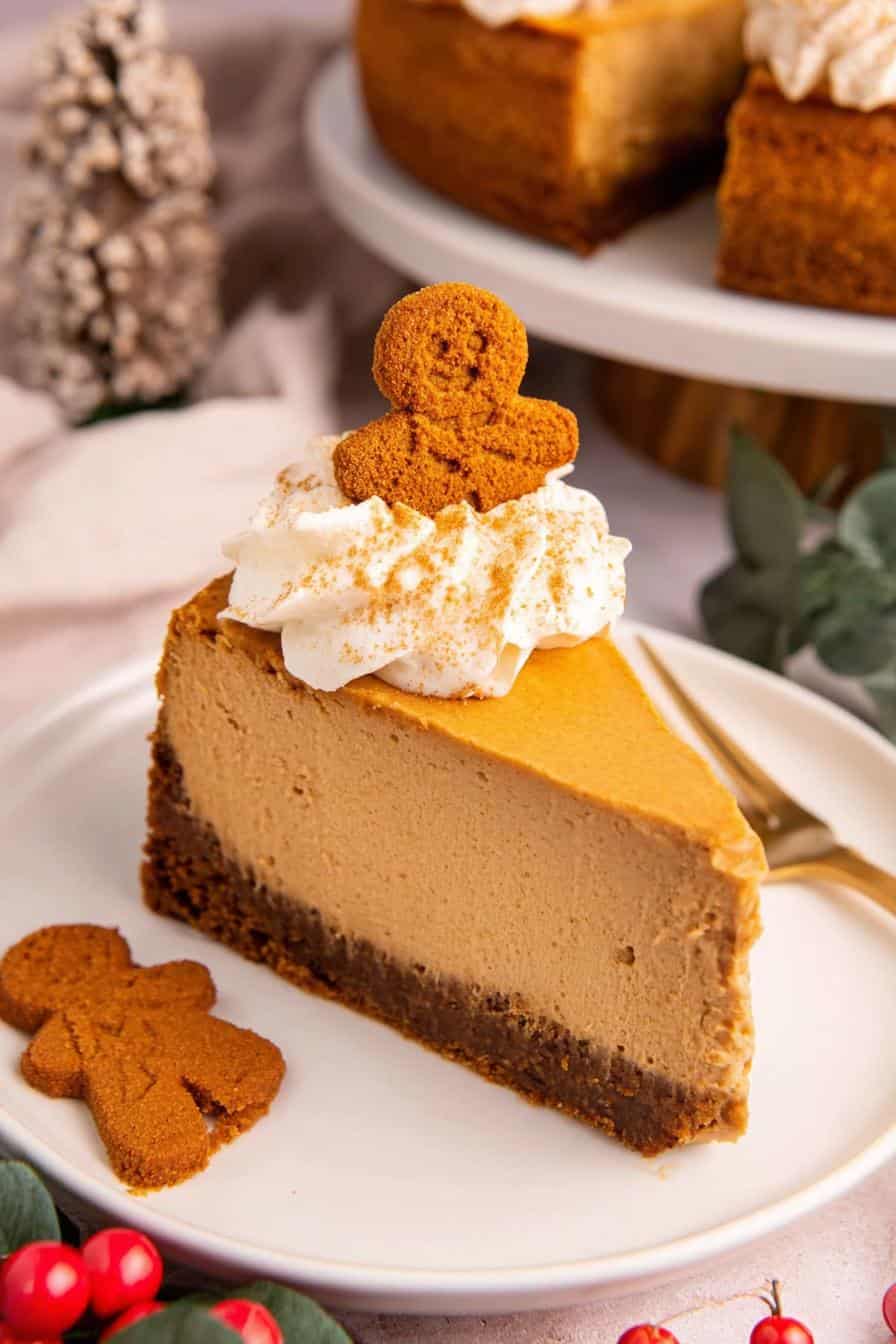 Indulge in a festive Gingerbread Cheesecake featuring a Biscoff cookie crust. This dessert combines the warm spices of gingerbread with the creamy richness of cheesecake.