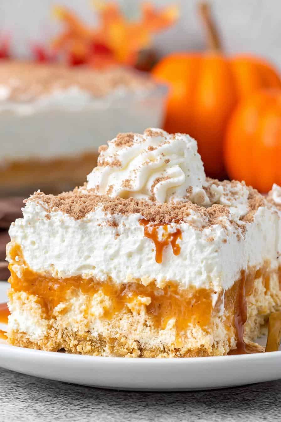 Okay, so you’ve got this amazing no bake pumpkin dessert… now what? Well, you could just grab a fork and go to town (and honestly, I wouldn’t blame you!). But if you wanna get fancy, here are a few ideas: